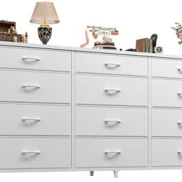 55″ Long Dresser for Bedroom with 12 Fabric Drawers, Entertainment Center for 60 inch TV Dressers & Chests of Drawers Large Organizer, Living Room, Metal Frame, Wood Top, White