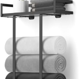 • Sale! Towel Racks for Bathroom Wall Mounted, Xstydes Metal Towel Holder with Wooden Shelf for Folding Large Towels, Towel Storage for Small Bathroom Organizer Decor or RV Camping, Black